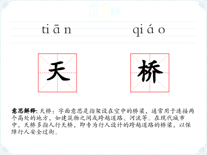 天桥:字面意思是指架设在空中的桥梁,通常用于连接两个高处的地方,如建筑物之间或跨越道路、河流等。在现代城市中,天桥多指人行天桥,即专为行人设计的跨越道路的桥梁,以保障行人安全过街。