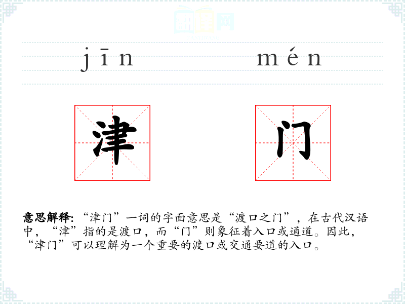 “津门”一词源自古代汉语,最初用于描述渡口的位置。随着时间的推移,它逐渐被用来指代重要的交通枢纽或军事要塞。在现代汉语中,“津门”更多地被用作地名,如天津的别称。