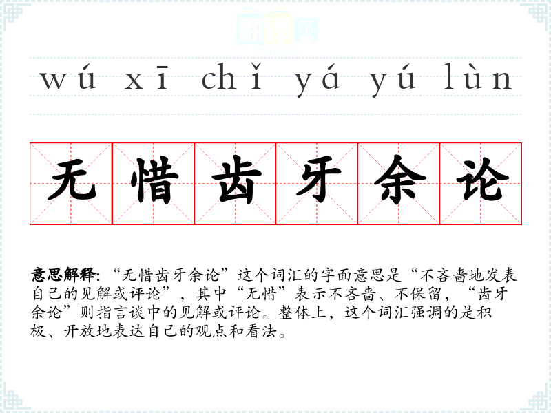 “无惜齿牙余论”这个词汇的字面意思是“不吝啬地发表自己的见解或评论”,其中“无惜”表示不吝啬、不保留,“齿牙余论”则指言谈中的见解或评论。整体上,这个词汇强调的是积极、开放地表达自己的观点和看法。