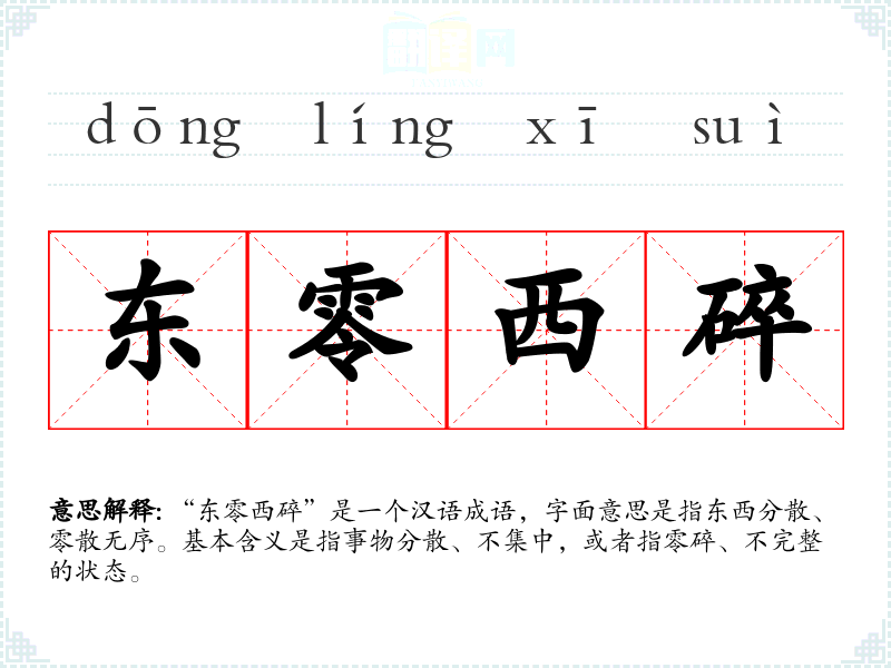 “东零西碎”是一个汉语成语,字面意思是指东西分散、零散无序。基本含义是指事物分散、不集中,或者指零碎、不完整的状态。