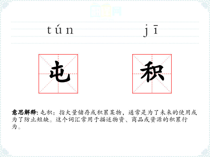 屯积:指大量储存或积累某物,通常是为了未来的使用或为了防止短缺。这个词汇常用于描述物资、商品或资源的积累行为。