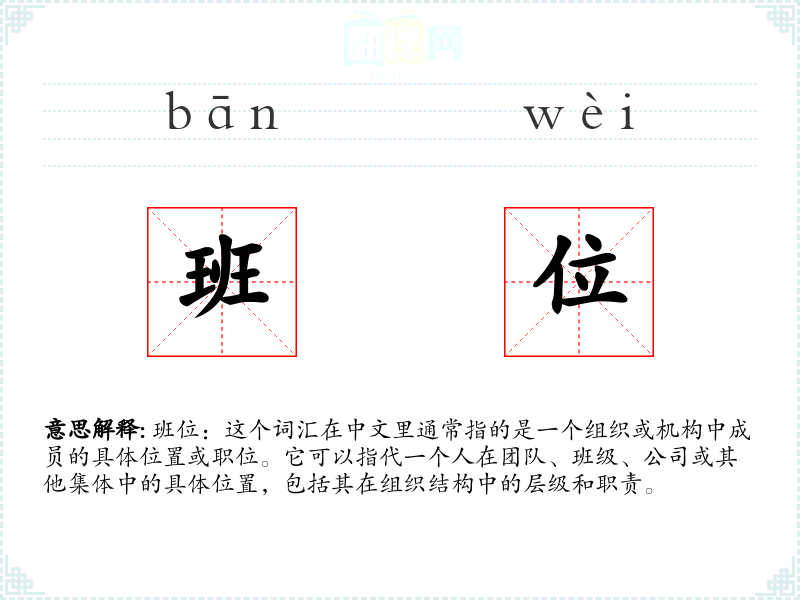 “班位”一词由“班”和“位”两个字组成。其中,“班”原指一群人或一组事物,而“位”则指位置或职位。这两个字结合在一起,形成了表示具体位置或职位的词汇。