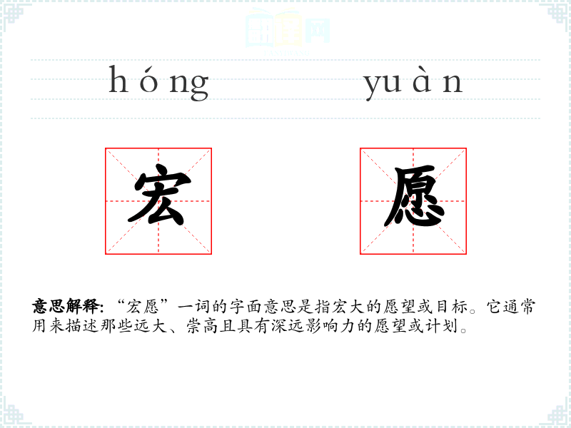 “宏愿”一词的字面意思是指宏大的愿望或目标。它通常用来描述那些远大、崇高且具有深远影响力的愿望或计划。