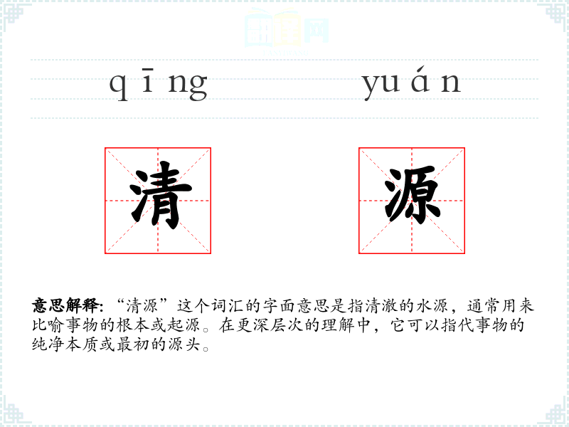“清源”这个词汇的字面意思是指清澈的水源,通常用来比喻事物的根本或起源。在更深层次的理解中,它可以指代事物的纯净本质或最初的源头。