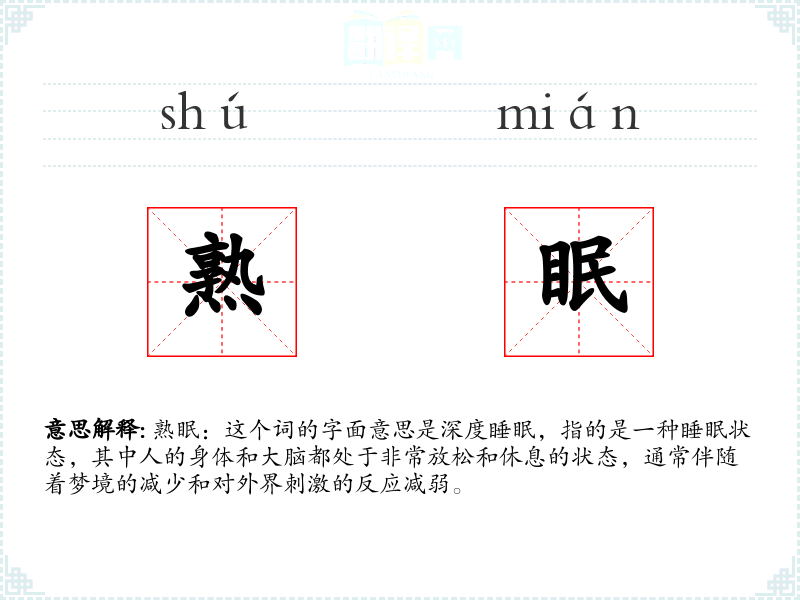 熟眠:这个词的字面意思是深度睡眠,指的是一种睡眠状态,其中人的身体和大脑都处于非常放松和休息的状态,通常伴随着梦境的减少和对外界刺激的反应减弱。