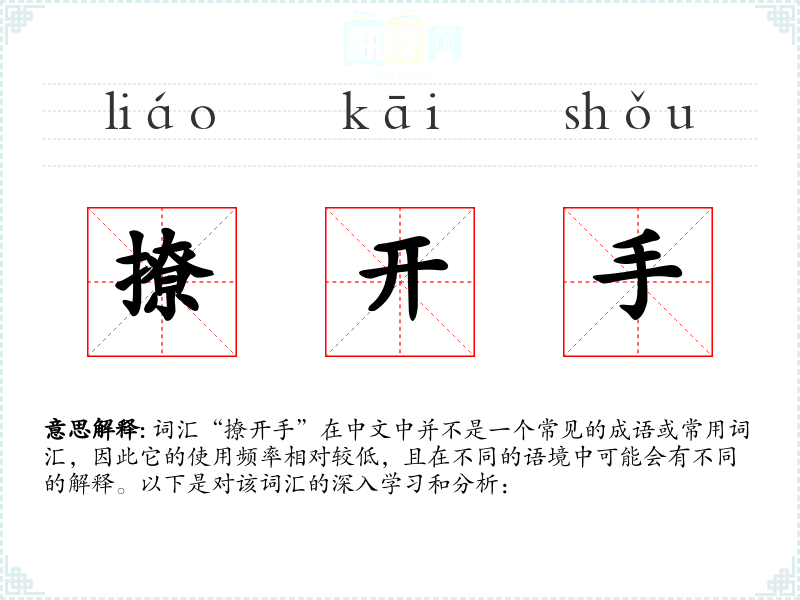 词汇“撩开手”在中文中并不是一个常见的成语或常用词汇,因此它的使用频率相对较低,且在不同的语境中可能会有不同的解释。以下是对该词汇的深入学习和分析: