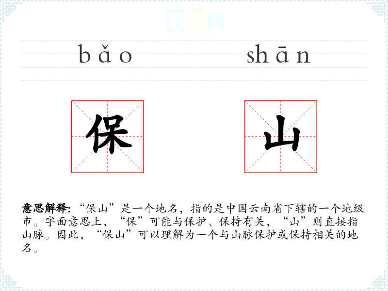 “保山”是一个地名,指的是**云南省下辖的一个地级市。字面意思上,“保”可能与保护、保持有关,“山”则直接指山脉。因此,“保山”可以理解为一个与山脉保护或保持相关的地名。