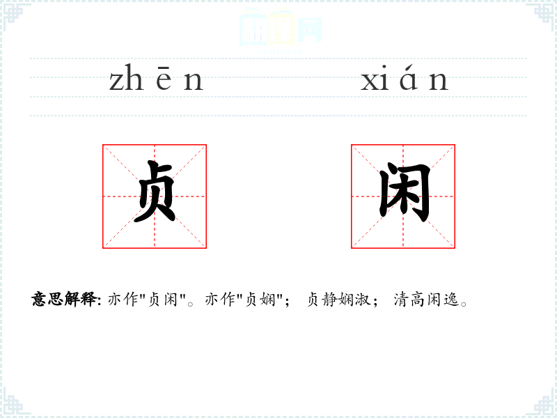亦作"贞闲"。亦作"贞娴"; 贞静娴淑; 清高闲逸。