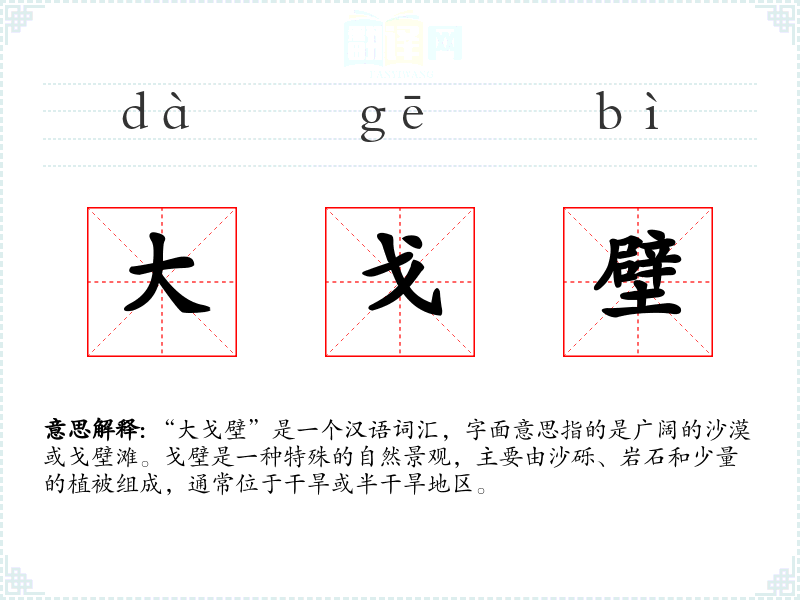 “大戈壁”是一个汉语词汇,字面意思指的是广阔的沙漠或戈壁滩。戈壁是一种特殊的自然景观,主要由沙砾、岩石和少量的植被组成,通常位于干旱或半干旱地区。