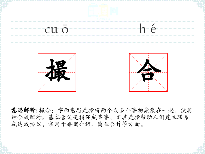 撮合:字面意思是指将两个或多个事物聚集在一起,使其结合或配对。基本含义是指促成某事,尤其是指帮助人们建立联系或达成协议,常用于婚姻介绍、商业合作等方面。