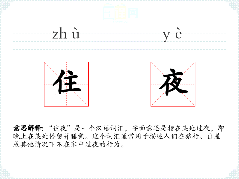 - 口语语境:在日常口语中,“住夜”是一个常用词汇,用于描述在外过夜的情况,如“我今晚不住家里,要去朋友家住夜”。