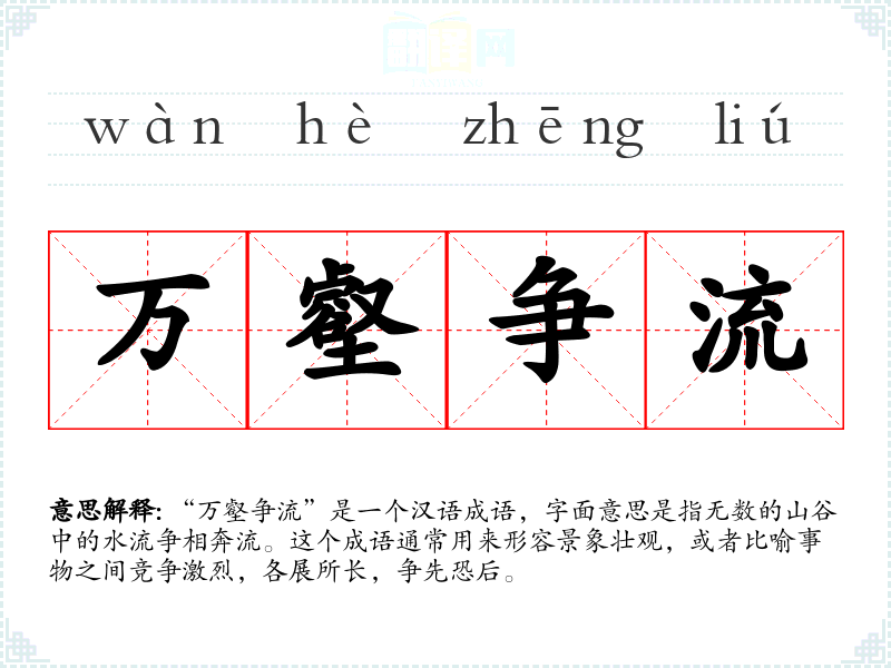 “万壑争流”是一个汉语成语,字面意思是指无数的山谷中的水流争相奔流。这个成语通常用来形容景象壮观,或者比喻事物之间竞争激烈,各展所长,争先恐后。