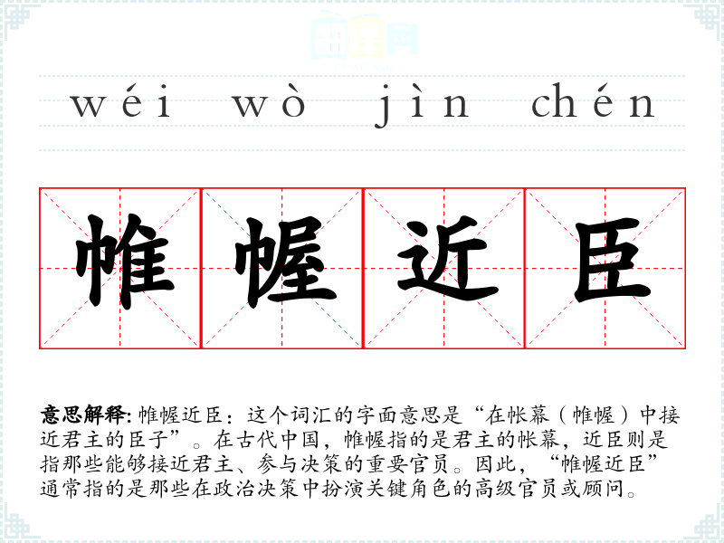 帷幄近臣:这个词汇的字面意思是“在帐幕(帷幄)中接近君主的臣子”。在古代**,帷幄指的是君主的帐幕,近臣则是指那些能够接近君主、参与决策的重要官员。因此,“帷幄近臣”通常指的是那些在政治决策中扮演关键角色的高级官员或顾问。