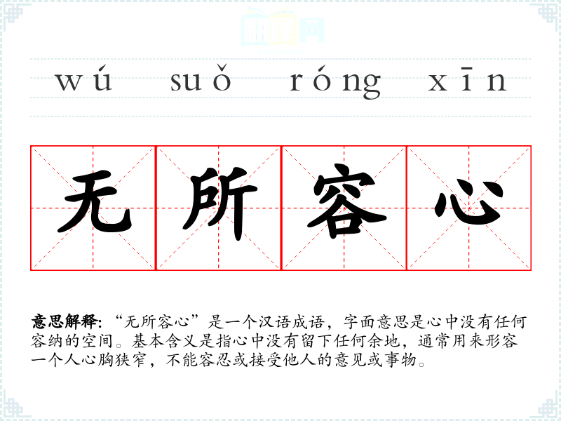 在文学作品中,“无所容心”常用来描绘那些固执己见、不容他人的人。在口语中,这个词汇可能不常用,但在某些特定的语境下,如讨论人的性格或态度时,可能会被提及。在专业领域,如心理学或人际关系研究中,这个词汇可以用来描述某些人的心理状态或行为模式。