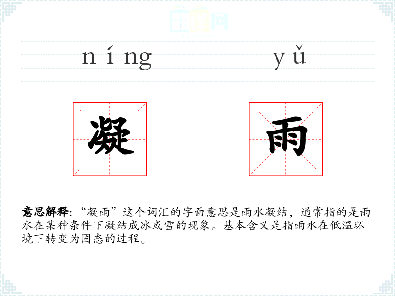 “凝雨”这个词汇的字面意思是雨水凝结,通常指的是雨水在某种条件下凝结成冰或雪的现象。基本含义是指雨水在低温环境下转变为固态的过程。