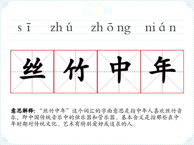 “丝竹”一词源自**古代对弦乐器和管乐器的统称,如古筝、笛子等。随着时间的推移,“丝竹中年”这个词汇逐渐被用来形容那些在中年时期对这些传统乐器有特别爱好的人。