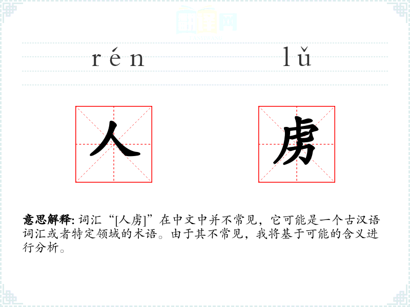 词汇“[人虏]”在中文中并不常见,它可能是一个古汉语词汇或者特定领域的术语。由于其不常见,我将基于可能的含义进行分析。