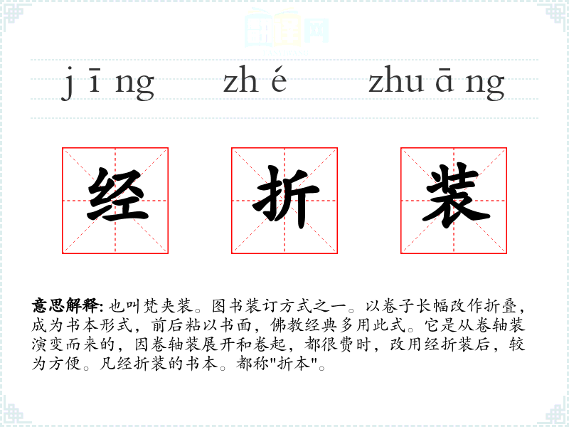 1.也叫梵夹装。图书装订方式之一。以卷子长幅改作折叠,成为书本形式,前后粘以书面,佛教经典多用此式。它是从卷轴装演变而来的,因卷轴装展开和卷起,都很费时,改用经折装后,较为方便。凡经折装的书本。都称"折本"。