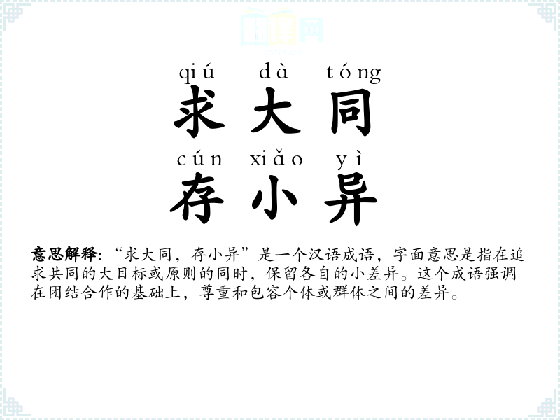 “求大同,存小异”是一个汉语成语,字面意思是指在追求共同的大目标或原则的同时,保留各自的小差异。这个成语强调在团结合作的基础上,尊重和包容个体或群体之间的差异。