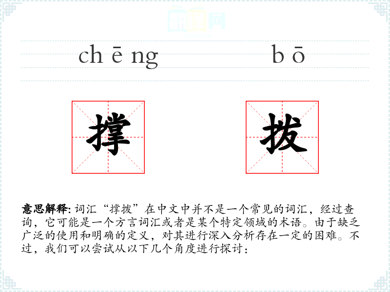 由于“撑拨”不是一个标准汉语词汇,我们无法给出一个确切的基本定义。它可能是指某种动作或行为,但在普通话中并不常见。