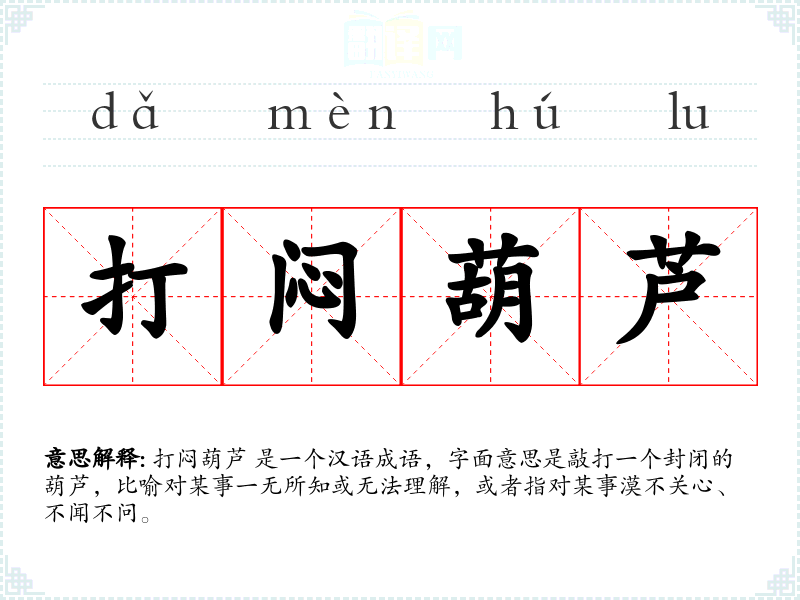 打闷葫芦 是一个汉语成语,字面意思是敲打一个封闭的葫芦,比喻对某事一无所知或无法理解,或者指对某事漠不关心、不闻不问。