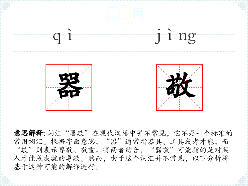 词汇“器敬”在现代汉语中并不常见,它不是一个标准的常用词汇。根据字面意思,“器”通常指器具、工具或者才能,而“敬”则表示尊敬、敬重。将两者结合,“器敬”可能指的是对某人才能或成就的尊敬。然而,由于这个词汇并不常见,以下分析将基于这种可能的解释进行。