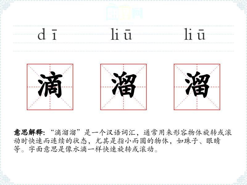 “滴溜溜”是一个汉语词汇,通常用来形容物体旋转或滚动时快速而连续的状态,尤其是指小而圆的物体,如珠子、眼睛等。字面意思是像水滴一样快速旋转或滚动。