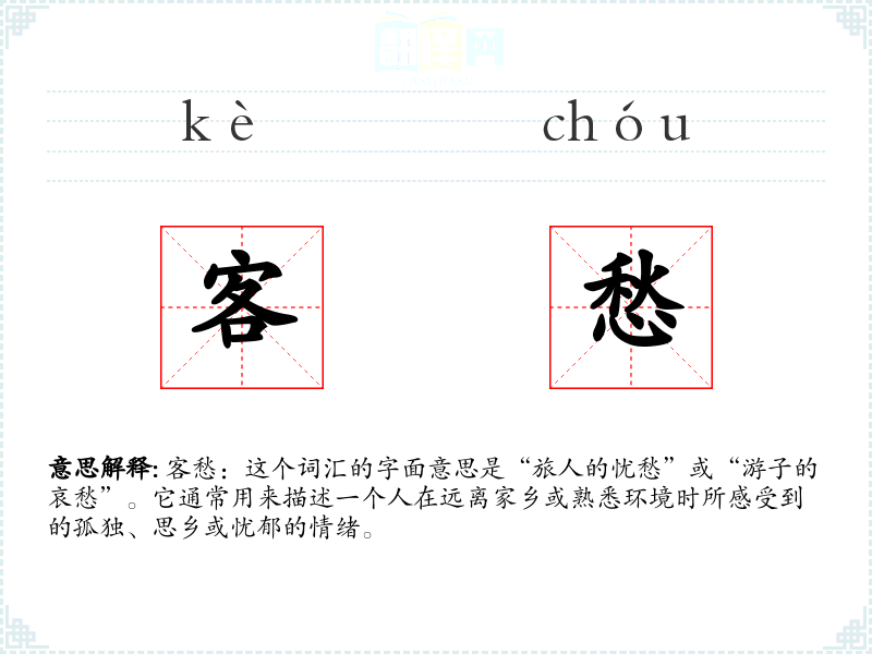 客愁:这个词汇的字面意思是“旅人的忧愁”或“游子的哀愁”。它通常用来描述一个人在远离家乡或熟悉环境时所感受到的孤独、思乡或忧郁的情绪。