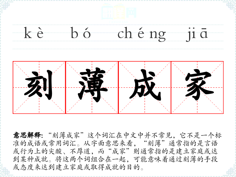 由于“刻成家”不是一个标准词汇,它的词源和演变不太明确。通常,“刻”这个词源于古代汉语,用来形容人的性格或行为,而“成家”则是一个较为常见的词汇,指的是建立家庭或达到某种成就。