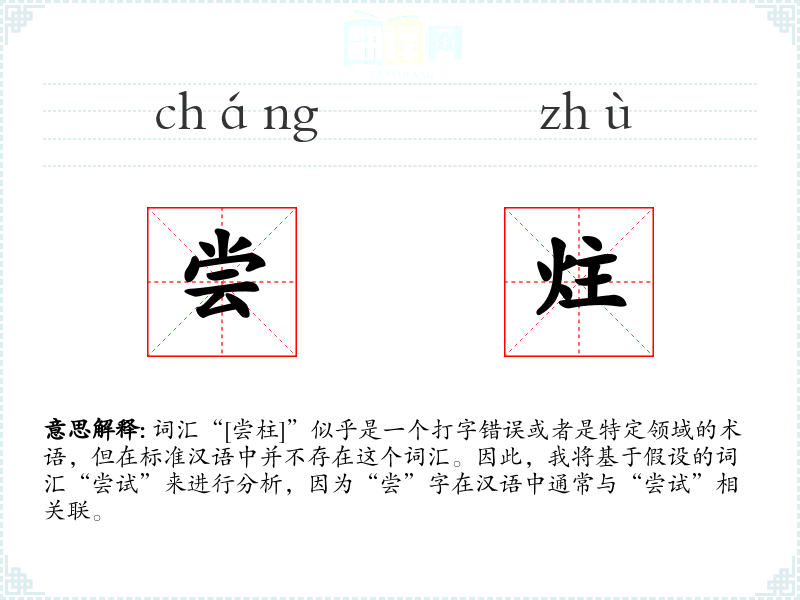 词汇“[尝柱]”似乎是一个打字错误或者是特定领域的术语,但在标准汉语中并不存在这个词汇。因此,我将基于假设的词汇“尝试”来进行分析,因为“尝”字在汉语中通常与“尝试”相关联。