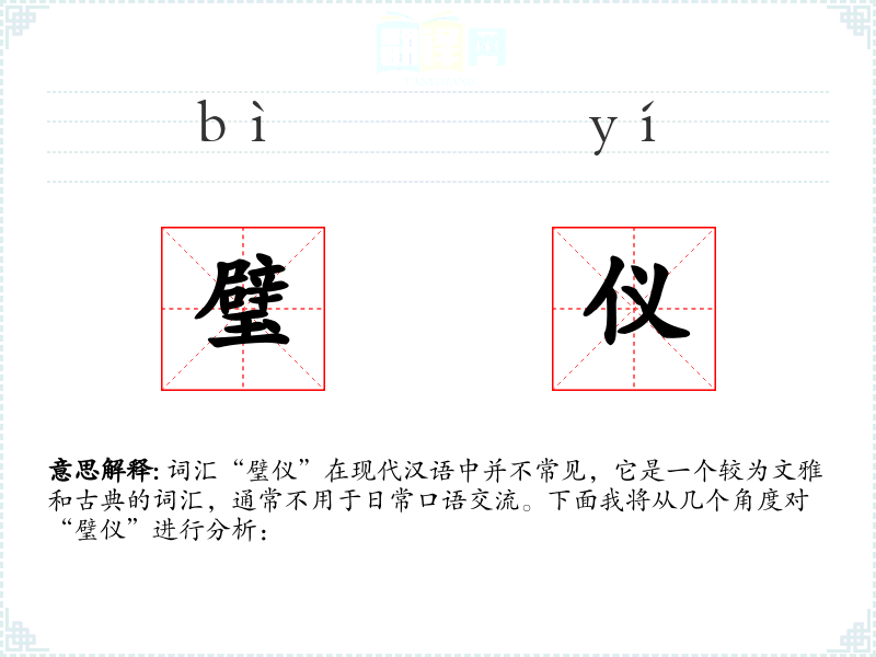 词汇“璧仪”在现代汉语中并不常见,它是一个较为文雅和古典的词汇,通常不用于日常口语交流。下面我将从几个角度对“璧仪”进行分析: