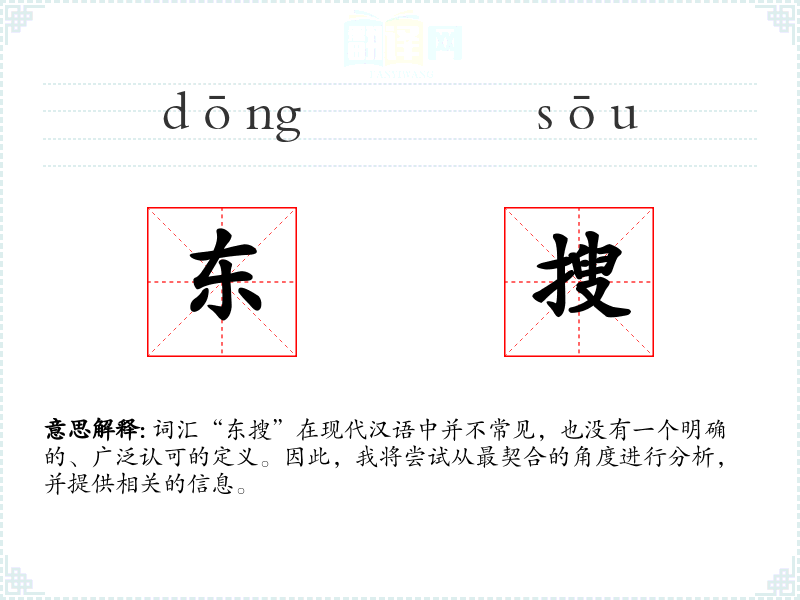 由于“东搜”不是一个标准的汉语词汇,我们无法给出一个确切的字面意思和基本含义。它可能是某个方言词汇、网络新词或者是某个特定领域的术语。