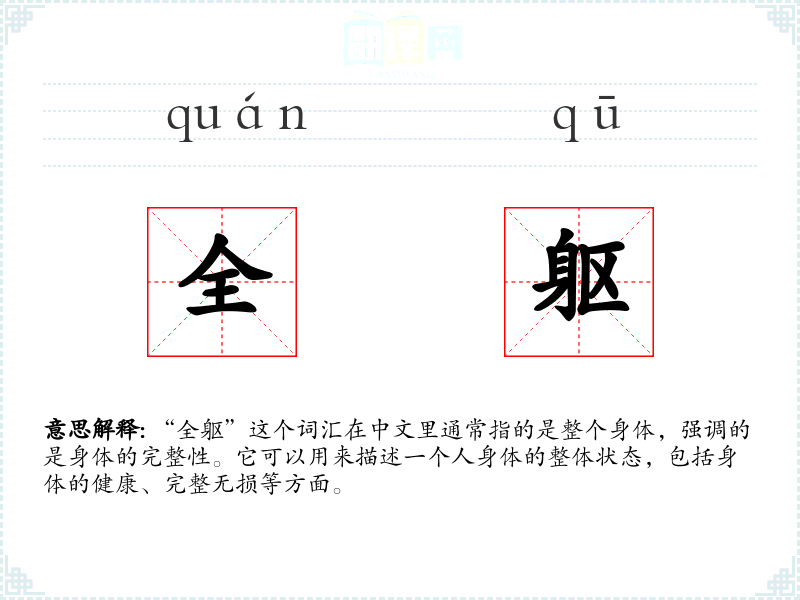 在英语中,“全躯”可以对应为“whole body”或“intact body”,虽然表达略有不同,但都强调了身体的完整性。