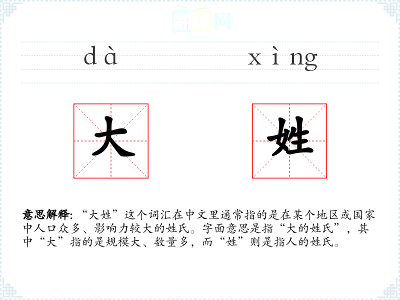“大姓”这个词汇不仅反映了姓氏在社会中的分布和影响力,也体现了人们对家族历史和社会地位的重视。在语言学*和表达中,了解和运用这个词汇可以帮助我们更好地理解文化背景和社会结构。