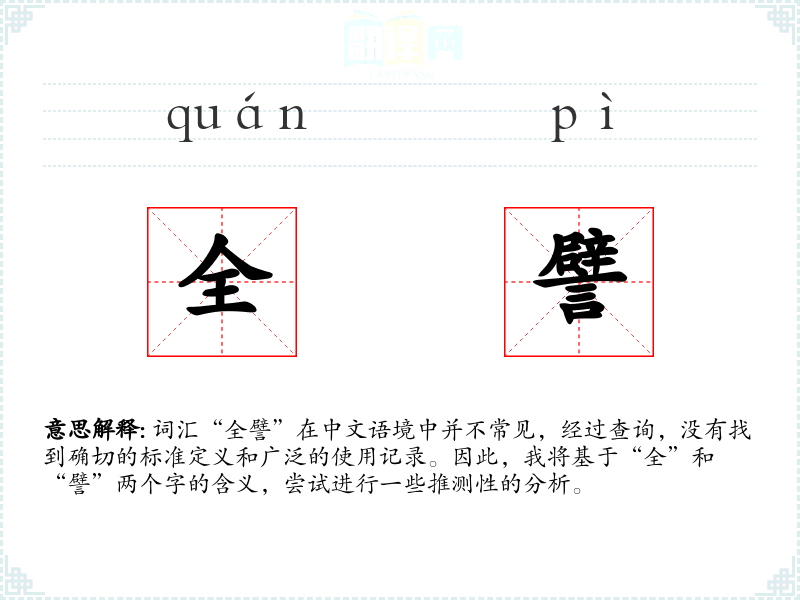 结合这两个字,“全譬”可能指的是一种全面的比喻或类比,即在比喻时考虑到所有相关的方面或细节。