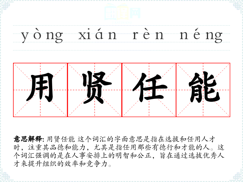 用贤任能 这个词汇的字面意思是指在选拔和任用人才时,注重其品德和能力,尤其是指任用那些有德行和才能的人。这个词汇强调的是在人事安排上的明智和公正,旨在通过选拔优秀人才来提升组织的效率和竞争力。