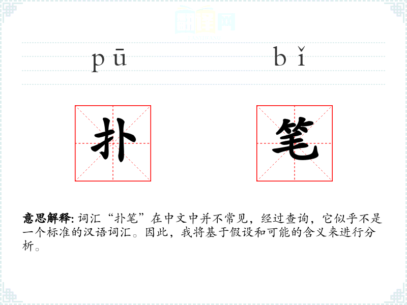 词汇“扑笔”在中文中并不常见,经过查询,它似乎不是一个标准的汉语词汇。因此,我将基于假设和可能的含义来进行分析。