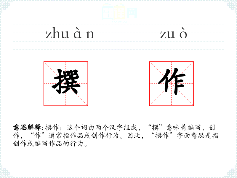 撰作:这个词由两个汉字组成,“撰”意味着编写、创作,“作”通常指作品或创作行为。因此,“撰作”字面意思是指创作或编写作品的行为。