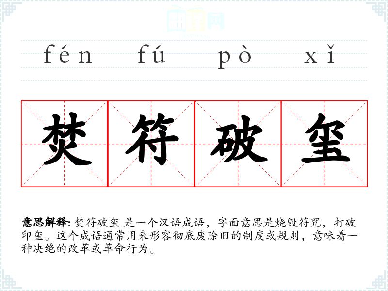 焚符破玺 是一个汉语成语,字面意思是烧毁符咒,打破印玺。这个成语通常用来形容彻底废除旧的制度或规则,意味着一种决绝的改革或革命行为。