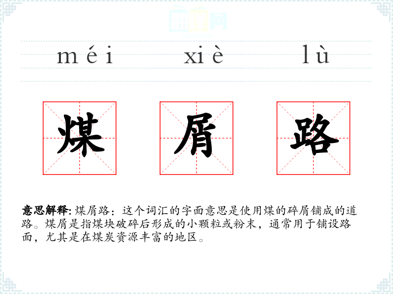 煤屑路:这个词汇的字面意思是使用煤的碎屑铺成的道路。煤屑是指煤块破碎后形成的小颗粒或粉末,通常用于铺设路面,尤其是在煤炭资源丰富的地区。