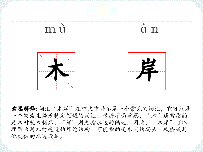 词汇“木岸”在中文中并不是一个常见的词汇,它可能是一个较为生僻或特定领域的词汇。根据字面意思,“木”通常指的是木材或木制品,“岸”则是指水边的陆地。因此,“木岸”可以理解为用木材建造的岸边结构,可能指的是木制的码头、栈桥或其他类似的水边设施。