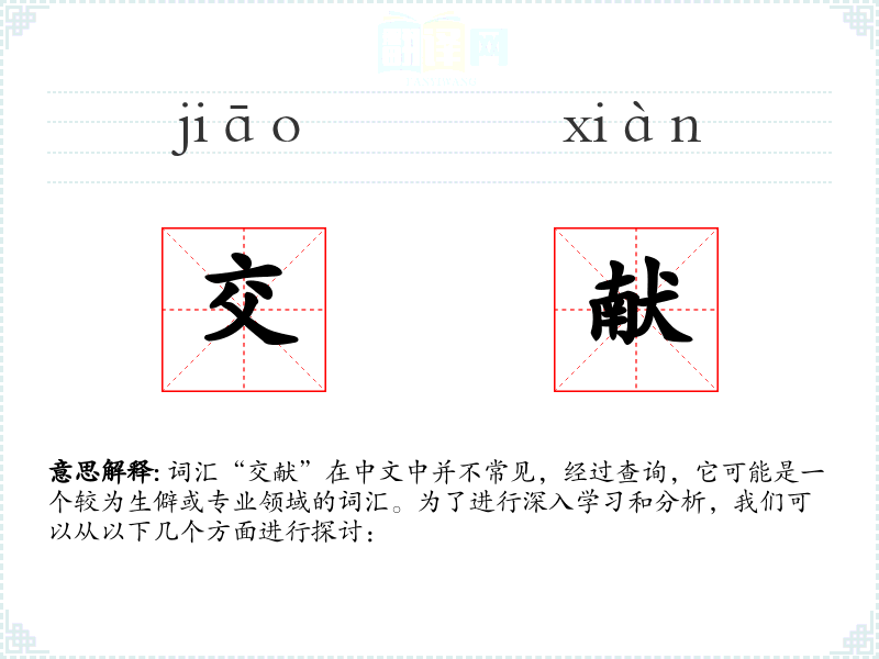 词汇“交献”在中文中并不常见,经过查询,它可能是一个较为生僻或专业领域的词汇。为了进行深入学*和分析,我们可以从以下几个方面进行探讨: