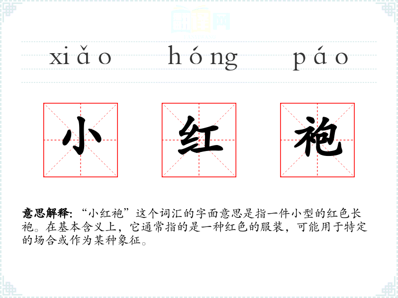 “小红袍”这个词汇的字面意思是指一件小型的红色长袍。在基本含义上,它通常指的是一种红色的服装,可能用于特定的场合或作为某种象征。