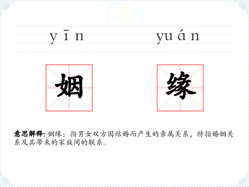 姻缘:指男女双方因结婚而产生的亲属关系,特指婚姻关系及其带来的家族间的联系。