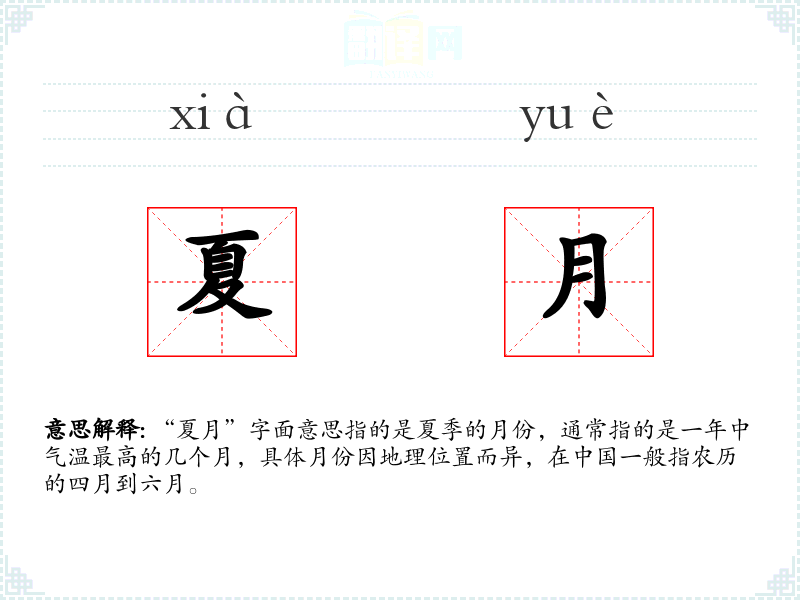 “夏月”一词源自古代汉语,其中“夏”指夏天,“月”指月份。在古代文献中,如《诗经》、《楚辞》中已有使用,随着时间的推移,其基本含义保持不变。