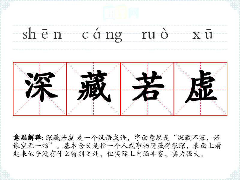深藏若虚 是一个汉语成语,字面意思是“深藏不露,好像空无一物”。基本含义是指一个人或事物隐藏得很深,表面上看起来似乎没有什么特别之处,但实际上内涵丰富,实力强大。