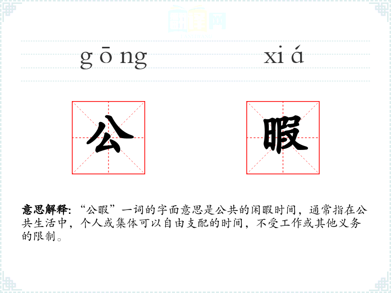 “公暇”一词的字面意思是公共的闲暇时间,通常指在公共生活中,个人或集体可以自由支配的时间,不受工作或其他义务的限制。