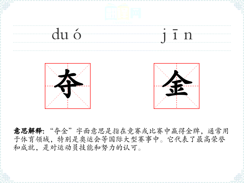 - 专业领域:在体育新闻报道中,“夺金”是描述**员赢得比赛的标准词汇。