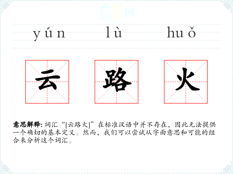 词汇“[云路火]”在标准汉语中并不存在,因此无法提供一个确切的基本定义。然而,我们可以尝试从字面意思和可能的组合来分析这个词汇。
