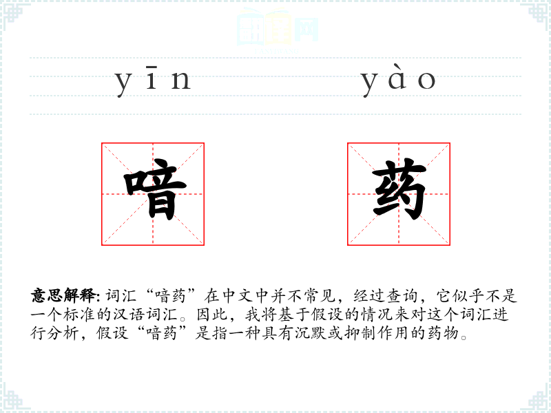 词汇“喑药”在中文中并不常见,经过查询,它似乎不是一个标准的汉语词汇。因此,我将基于假设的情况来对这个词汇进行分析,假设“喑药”是指一种具有沉默或抑制作用的药物。